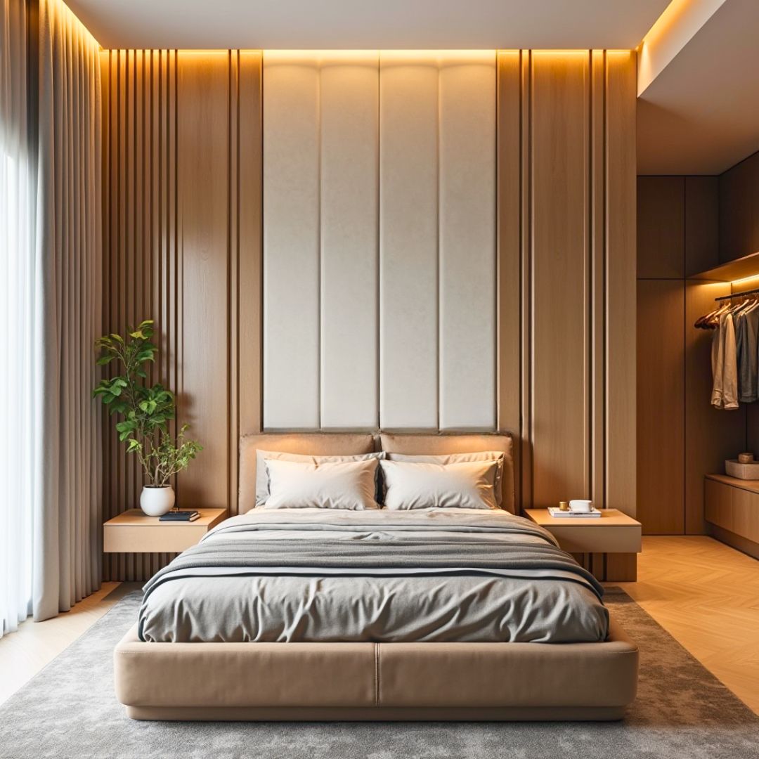 Phòng ngủ này sử dụng tone gỗ sáng, kết hợp ánh sáng âm trần theo chiều dọc. Vòm cao tạo chiều sâu thị giác nhưng được làm mềm lại bằng đường chỉ cong và màu sắc trung tính. Phù hợp với những ai muốn sự thư giãn tinh tế, không phô trương.