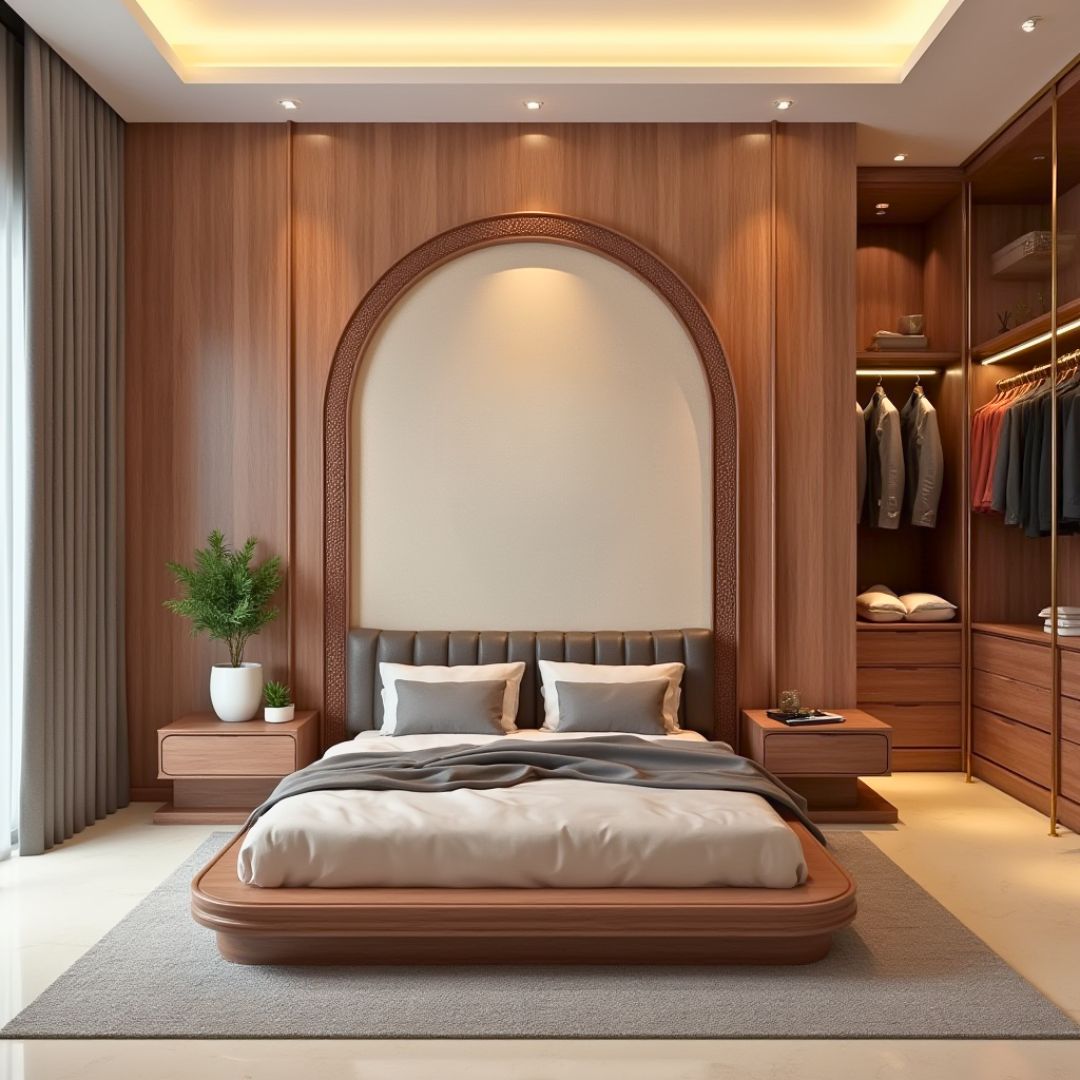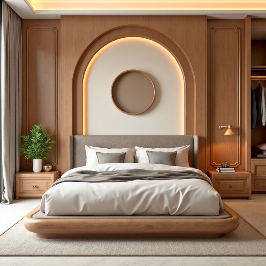 Thiết kế này ghi điểm nhờ bố cục hài hòa giữa chiều cao đầu giường, vòm gỗ và tủ âm tường. Giường gỗ bo cong nhẹ mang lại cảm giác an toàn và ấm cúng. Ánh sáng âm và rèm vải tone lạnh giúp cân bằng với hệ vách gỗ ấm, tạo không gian hiện đại đúng chuẩn khách hàng thành đạt.