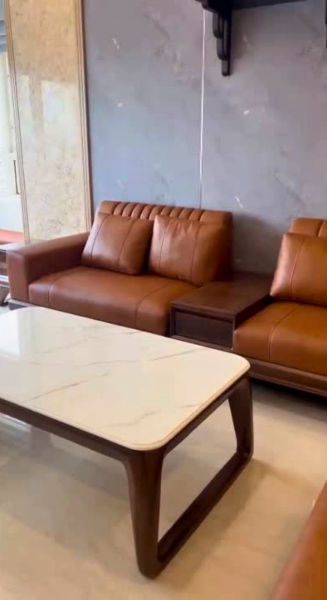 Chiếc bàn sofa với phần khung gỗ óc chó, kết hợp mặt đá sứ trắng Ý – không hoa văn cầu kỳ, chỉ là vài vân nhẹ như nét mực – đủ để làm dịu lại toàn bộ không gian, tạo cảm giác thư thái, sáng sủa và tự nhiên.