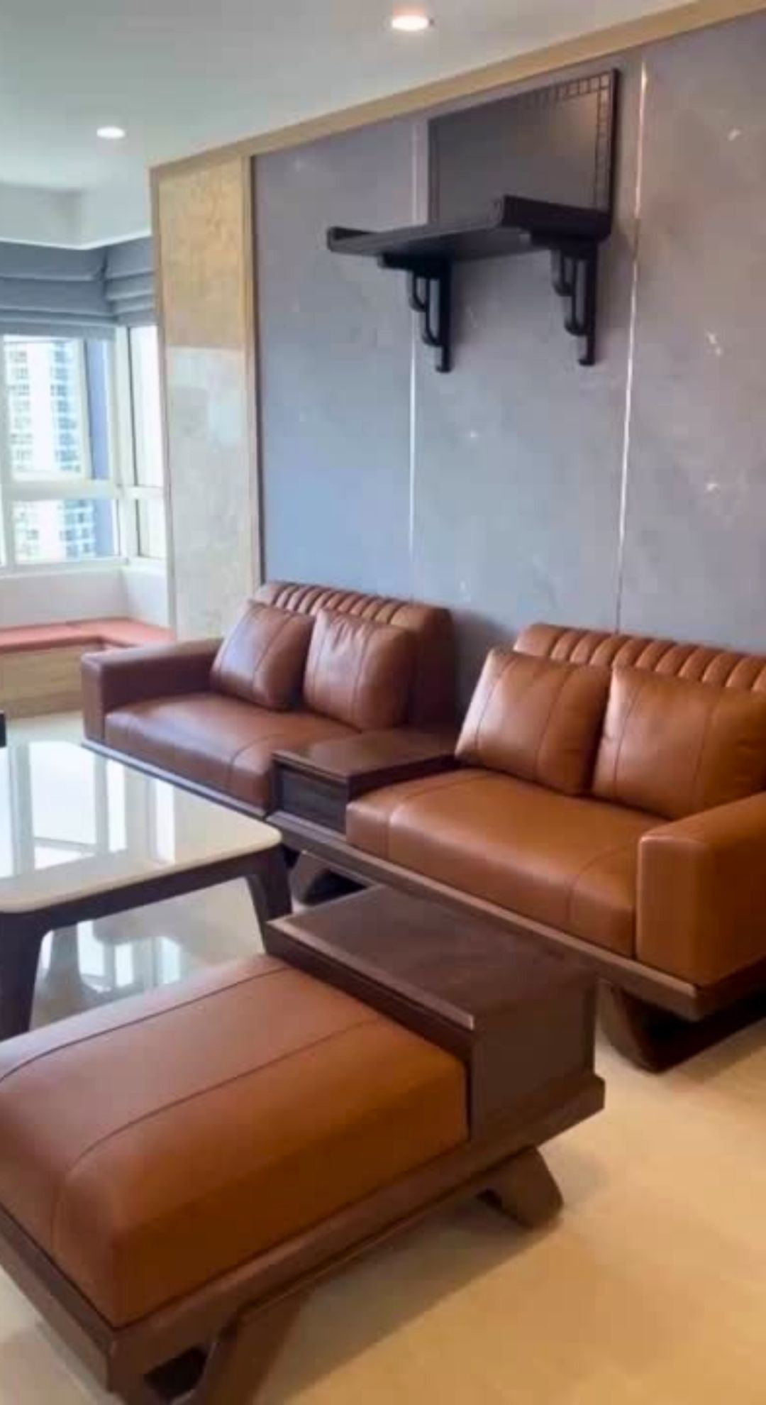 Bên cạnh bộ sofa là tường ốp đá và lam gỗ, sàn bóng nhẹ màu beige, hệ cửa sổ rộng đón ánh sáng tự nhiên. Tất cả đều góp phần nâng đỡ cho nhân vật chính – bộ sofa – tỏa sáng một cách lặng lẽ.
