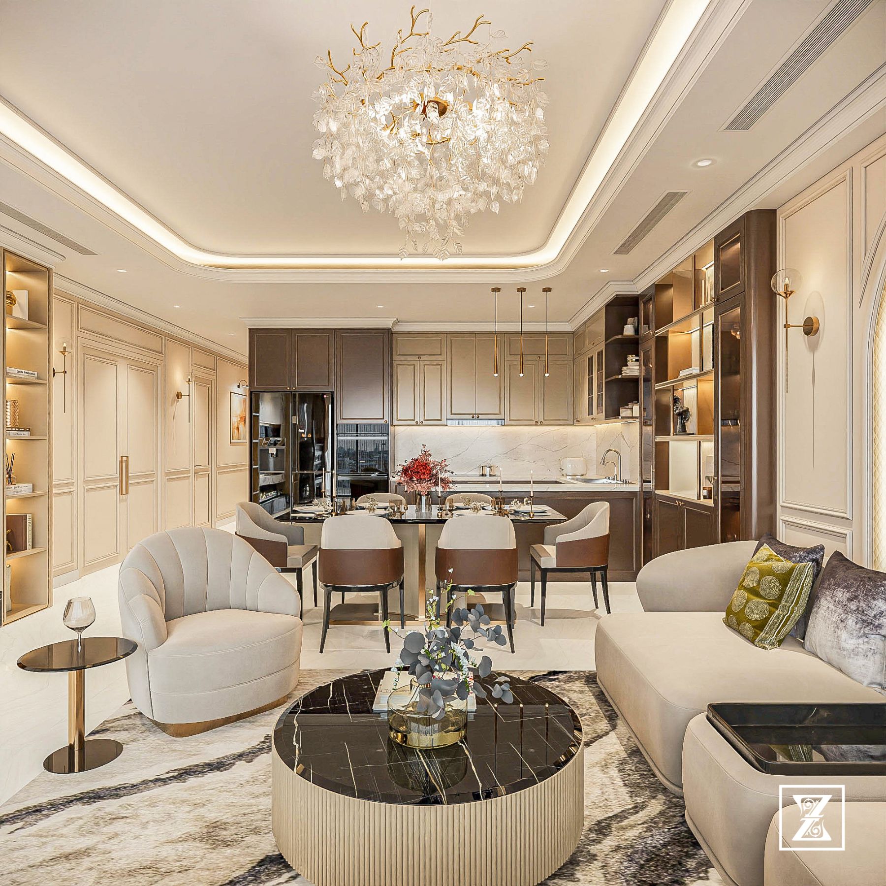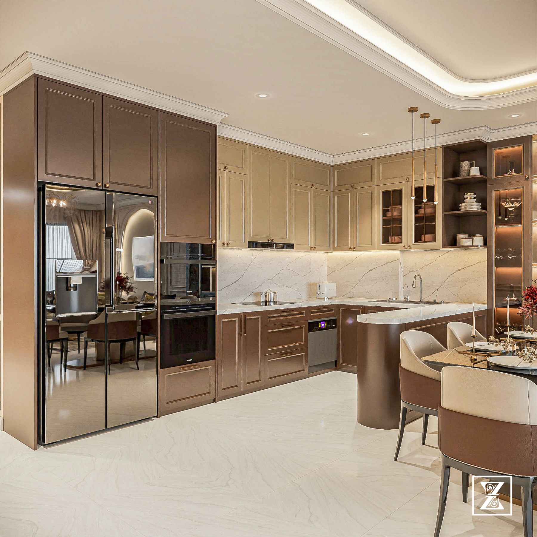 Sự phối hợp hài hòa giữa hệ tủ nâu – beige và mặt đá trắng vân marble tạo nên tổng thể sang trọng mà vẫn dễ chịu. Hệ đèn thả đồng ánh vàng giúp làm nổi bật cụm đảo bếp, đồng thời tăng chiều sâu cho không gian. Tủ lạnh âm, máy rửa chén, lò nướng… được bố trí gọn gàng mà không làm mất mỹ quan tổng thể.