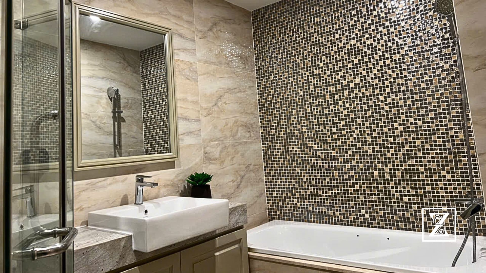 Tường ốp gạch vân đá kết hợp mảng mosaic ánh kim tạo hiệu ứng thị giác độc đáo. Lavabo đặt trên mặt đá xám vân tự nhiên, kèm gương khung phào sơn ánh champage – đúng tinh thần Modern Classic: nhã nhặn, sạch sẽ và sang trọng.
