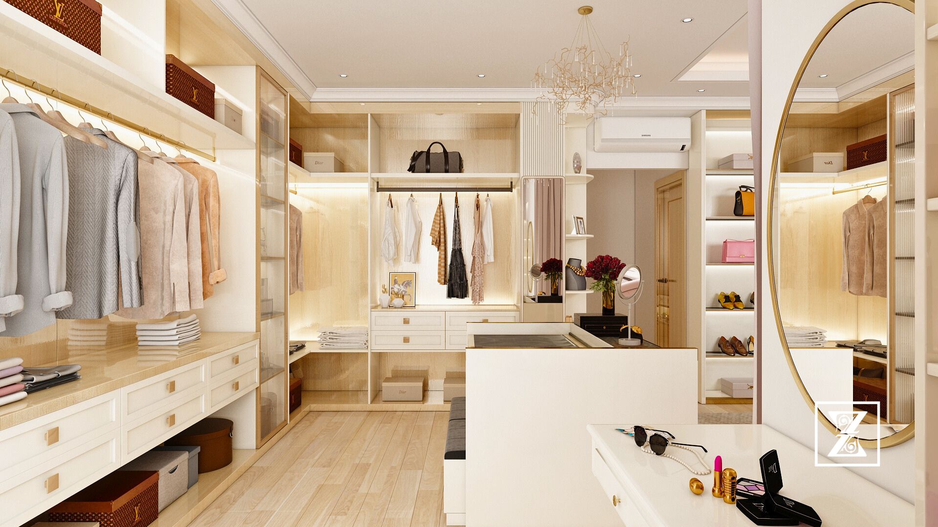 Mọi góc nhỏ đều phục vụ một mục đích: làm nổi bật cá tính, giữ gìn thẩm mỹ, và nuôi dưỡng tinh thần của người phụ nữ sống có chủ đích. Kệ túi được thiết kế như một gallery thu nhỏ. Tủ treo đồ chia ngăn thông minh – phù hợp với thói quen sống ngăn nắp. Bàn phấn đặt cạnh ánh sáng tự nhiên, giúp việc chăm sóc bản thân trở nên nhẹ nhàng như một nghi lễ mỗi sáng.