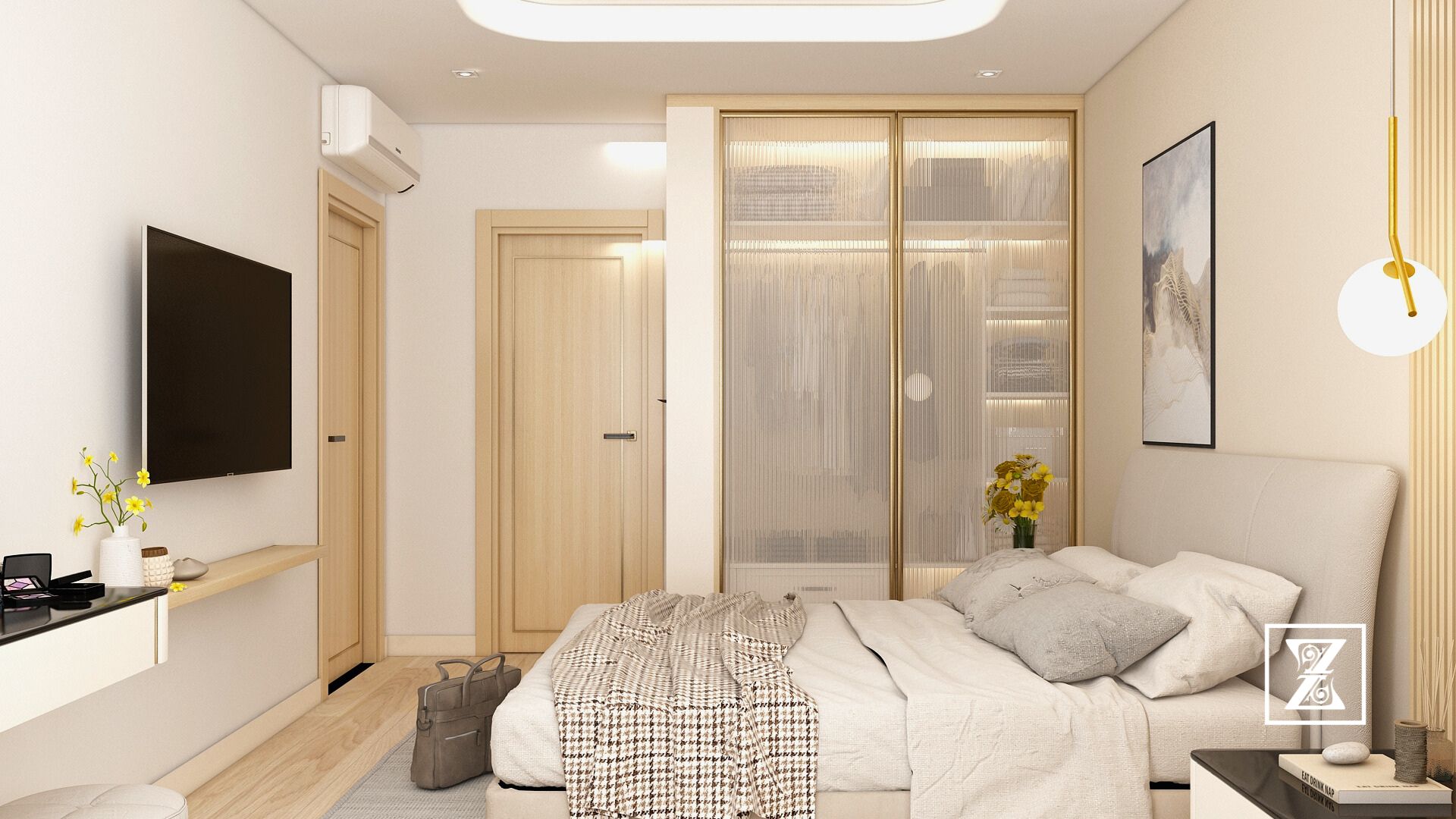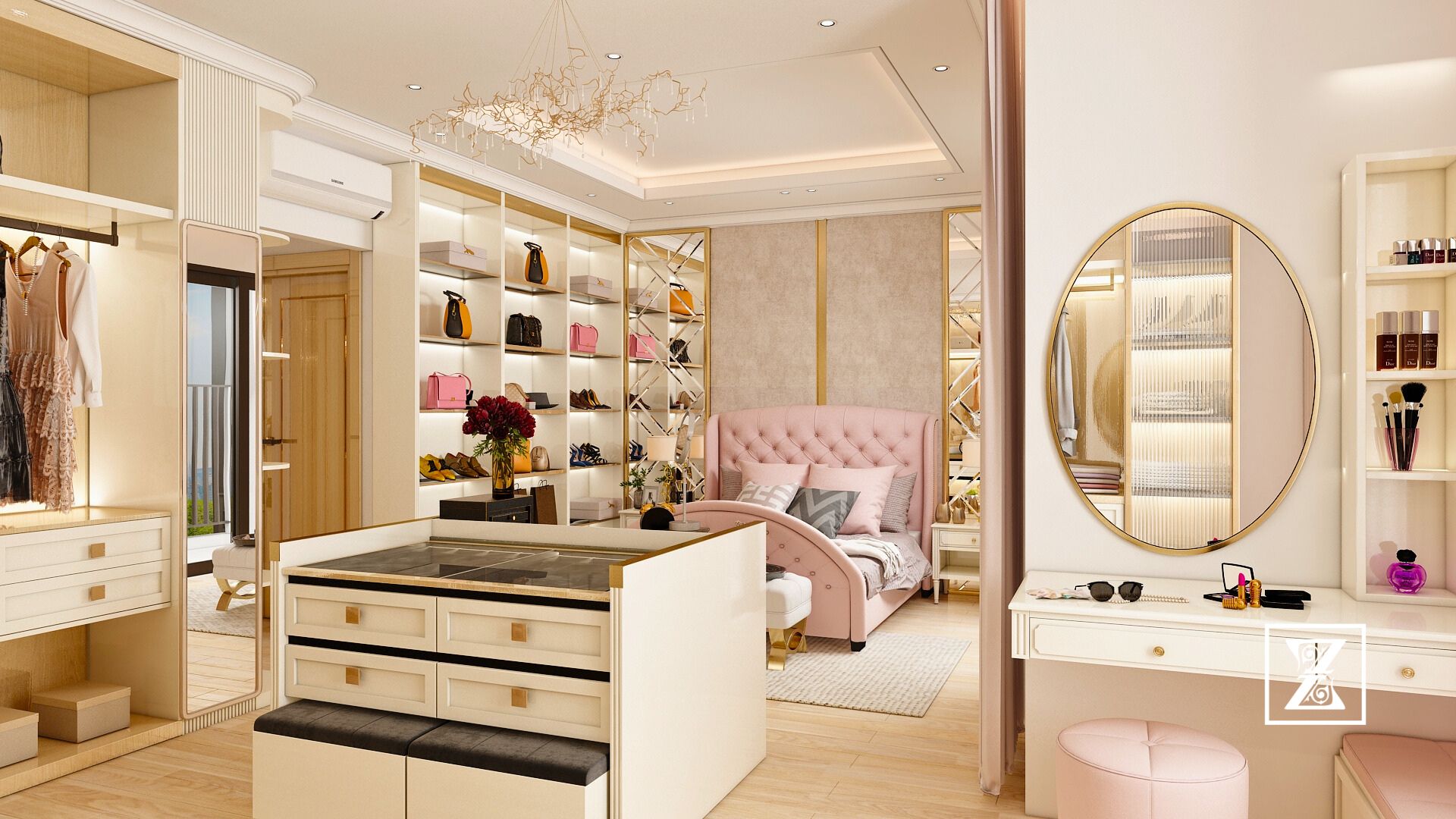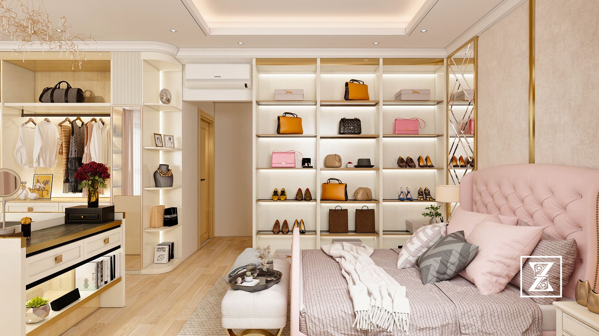 Phòng ngủ này được tạo nên từ sắc độ beige – pastel hồng nhẹ nhàng, mang đến cảm giác thư giãn, thanh lịch mà không mất đi chiều sâu. Chất liệu gỗ cao cấp, thiết kế mềm mại và đồng bộ xuyên suốt từ giường ngủ đến bàn trang điểm, kệ trưng bày túi xách, và cả hệ tủ walk-in closet phía sau.