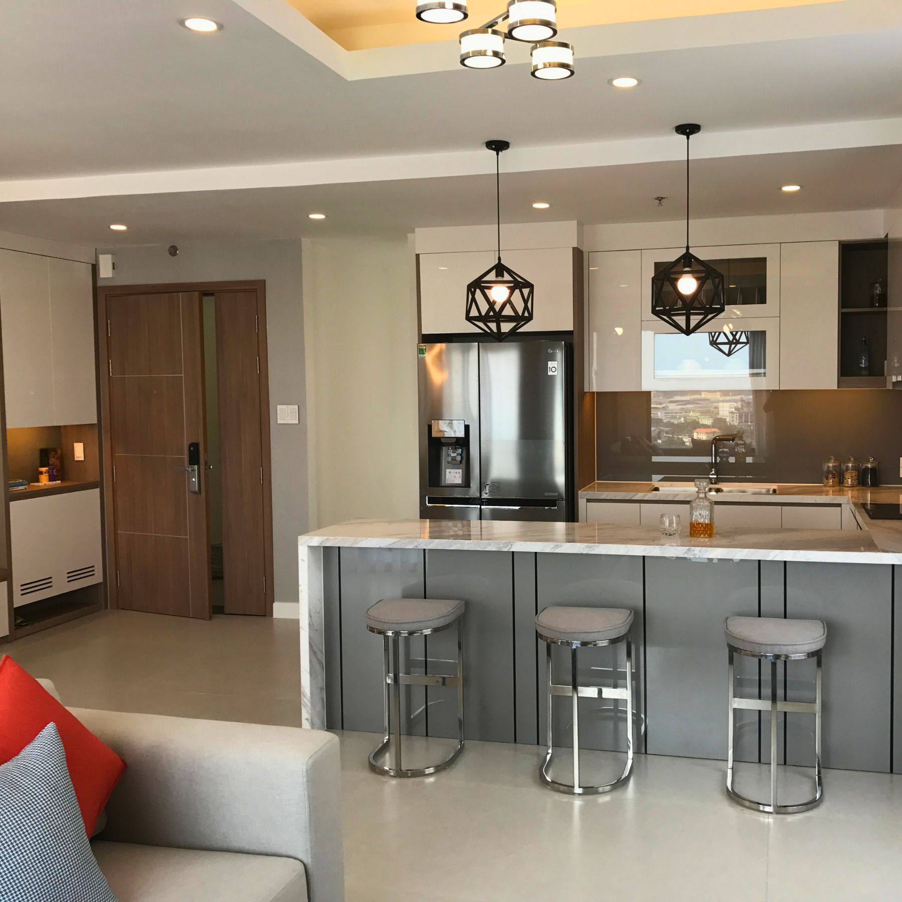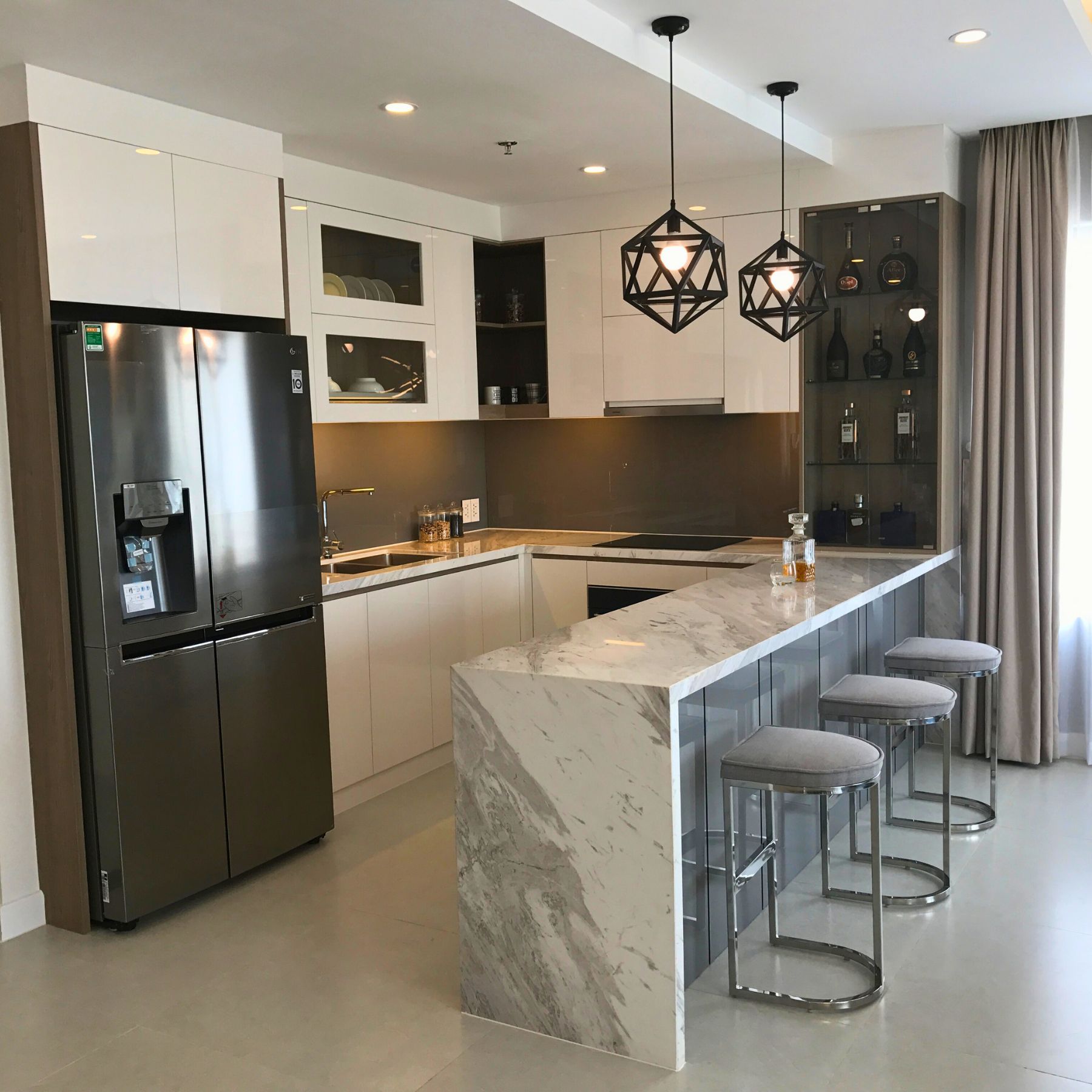 Không gian bếp bố trí bàn đảo đá vân mây, đi cùng tủ bếp chữ L và hệ tủ rượu âm tường. Tổng thể khu vực nấu ăn – ăn uống được xử lý đồng bộ về vật liệu, ánh sáng và tone màu – mang đến trải nghiệm sinh hoạt mượt mà, liền mạch.