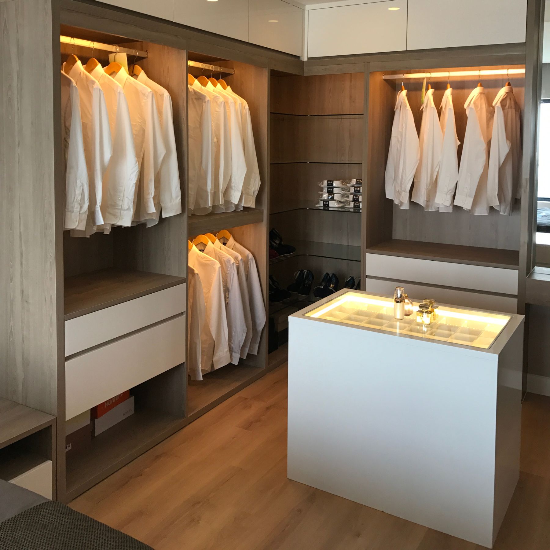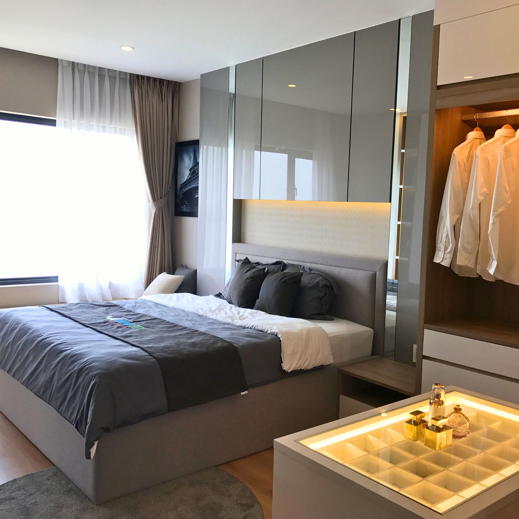 Phòng ngủ master kết hợp với tủ áo mở góc chữ L và đảo trưng bày nước hoa, tạo cảm giác như một walk-in closet thu nhỏ, phù hợp với lối sống chỉn chu. Các khu vực còn lại được xử lý nhẹ nhàng, tối giản hóa chi tiết nhưng vẫn đảm bảo công năng.