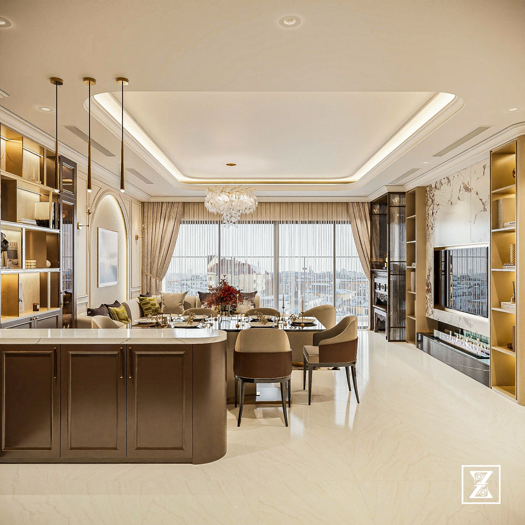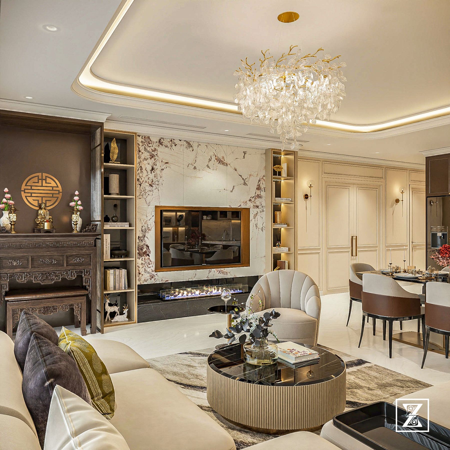 Chi tiết được xử lý khéo léo: từ đèn chùm pha lê với nhánh kim loại ánh gold, đến đường cong mềm mại của sofa và bàn tròn trung tâm. Tường sau TV được ốp đá vân mây tự nhiên, kết hợp kệ trưng bày âm tường, giúp không gian vừa đủ ấm cúng vừa có chiều sâu thị giác. Mỗi đồ vật, mỗi ánh sáng được bố trí có chủ đích – mang đến cảm giác "được chăm chút", "được trân trọng".