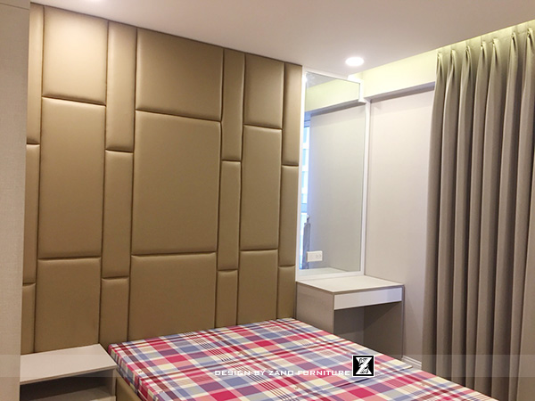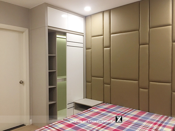 Chất liệu nỉ, gỗ sơn mờ và hệ rèm tone xám – be tạo nên một tổng thể dịu nhẹ. Giường và vách ốp đầu giường được xử lý tỉ mỉ, đảm bảo cảm giác êm dịu và thư giãn đúng chuẩn phong cách sống của người thành đạt bận rộn.