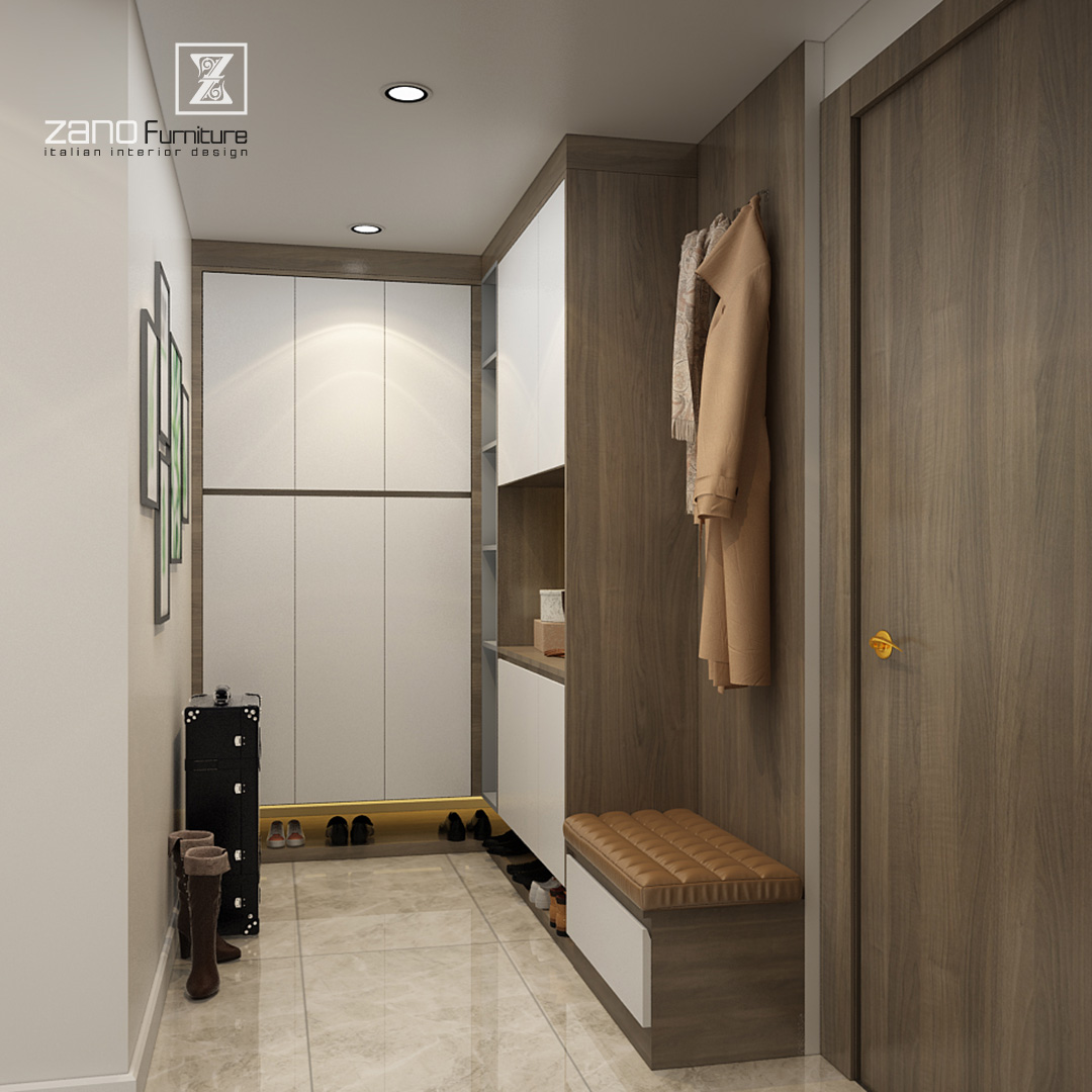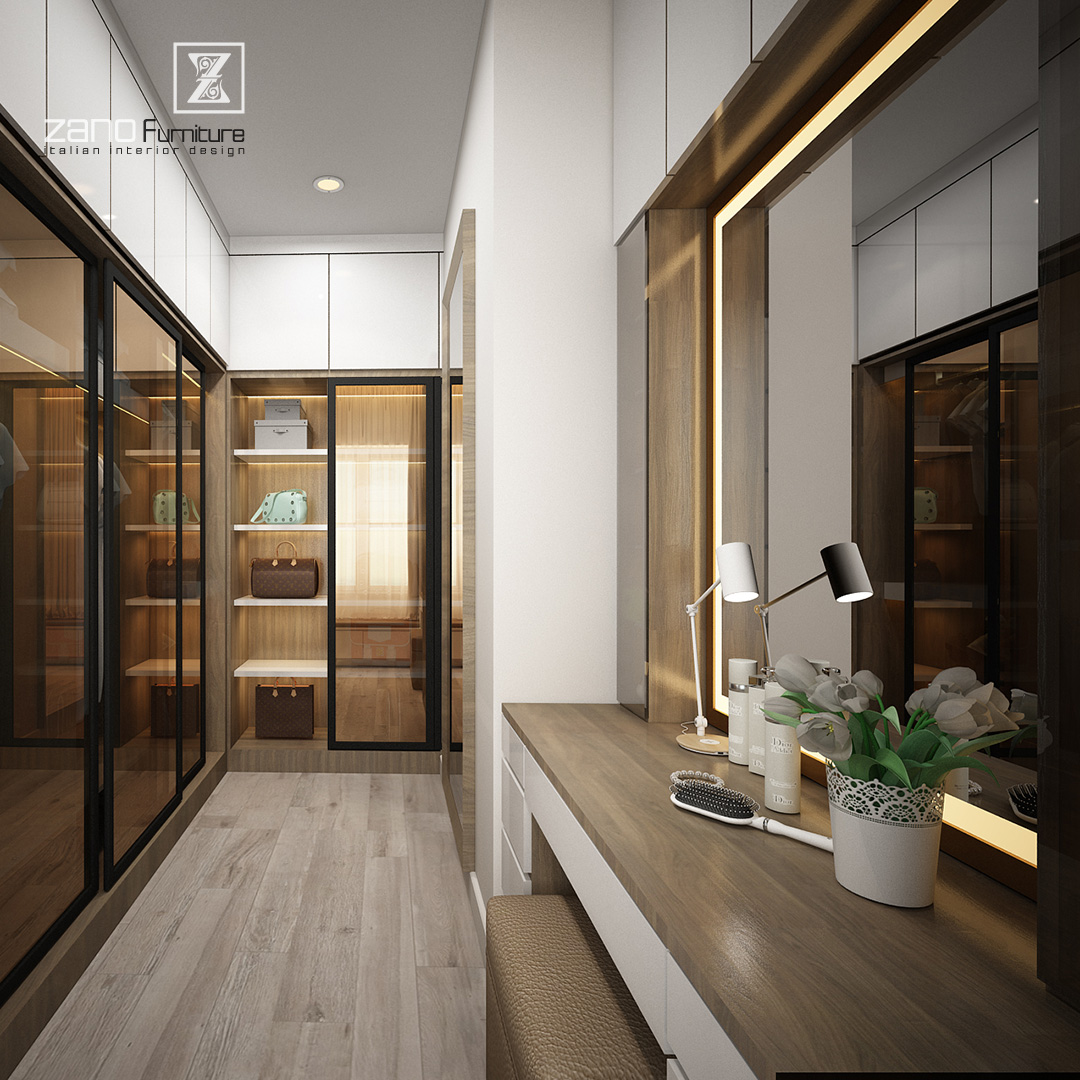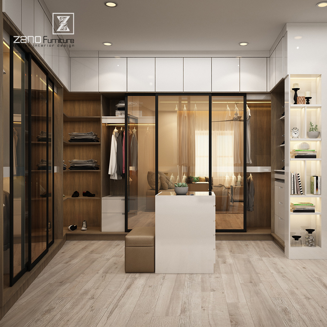 Phòng thay đồ: Thiết kế kệ và tủ kính trong suốt, tối ưu hóa không gian lưu trữ. Gương soi lớn kết hợp ánh sáng LED tinh tế.