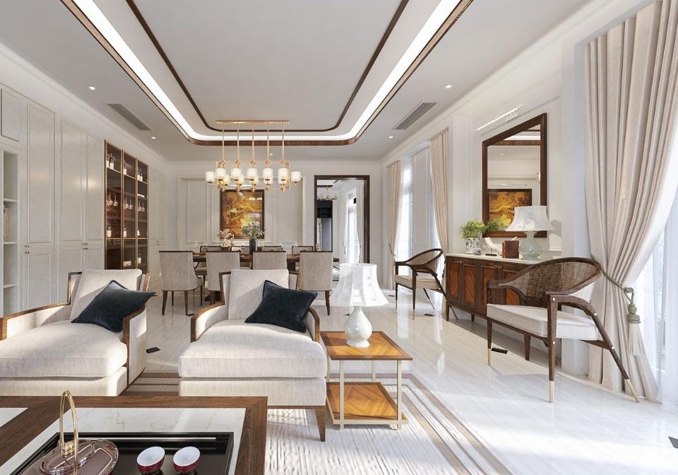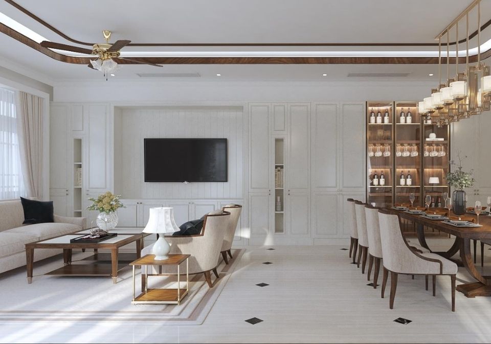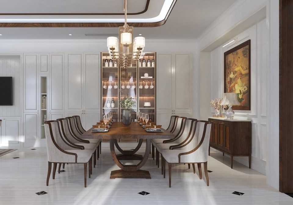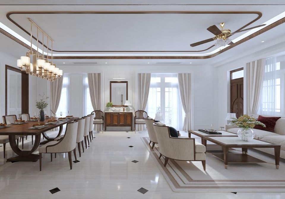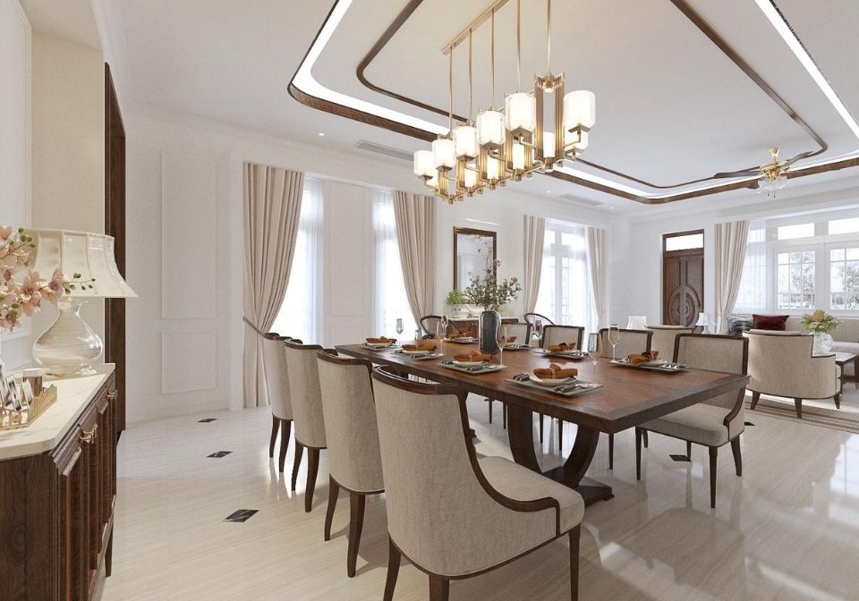 Phòng khách & phòng ăn được thiết kế mở liền nhau, ở giữa là điểm nhấn ánh sáng trần và hệ đèn chùm nhấn nhá, nhấn mạnh tinh thần gặn kết và quý tộc trong mỗi bữa ăn gia đình.