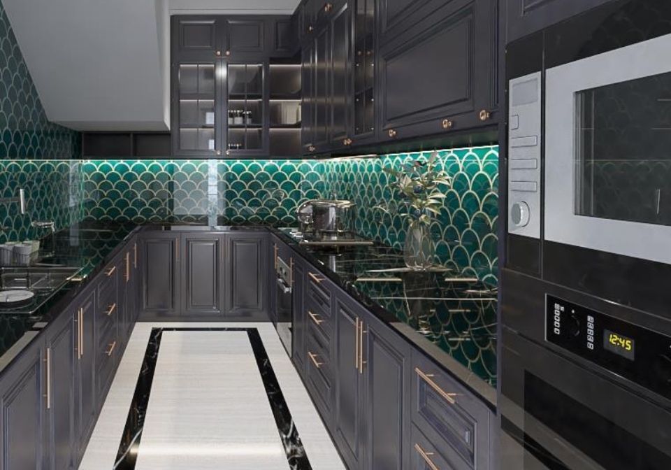 Khu bếp gây bất ngờ bằng tổng màu xanh ngọc bảo và tấm backsplash họa tiết vảy cá, làm nổi bật vùng chức năng quan trọng nhưng thường bị lạm quên trong nhiều thiết kế.