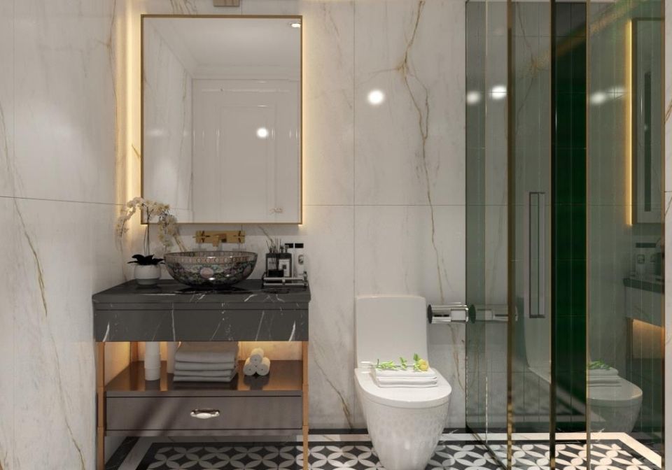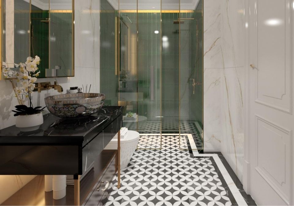 Nhà vệ sinh chung là không gian được đầu tư với gạch hoạ tiết mosaic và chậu rửa gốm trang trí, không chỉ đạt tiêu chuẩn thẩm mỹ mà còn thể hiện đây là một không gian được tôn trọng.