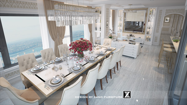 Phòng Bếp & Khu Vực Ăn – Đẳng Cấp & Tiện Nghi: Tủ bếp gỗ chạm khắc tinh xảo kết hợp mặt đá marble cao cấp. Bàn ăn lớn với ghế bọc da hoặc nỉ, chân kim loại mạ vàng sang trọng. Hệ thống đèn thả tạo điểm nhấn nghệ thuật.