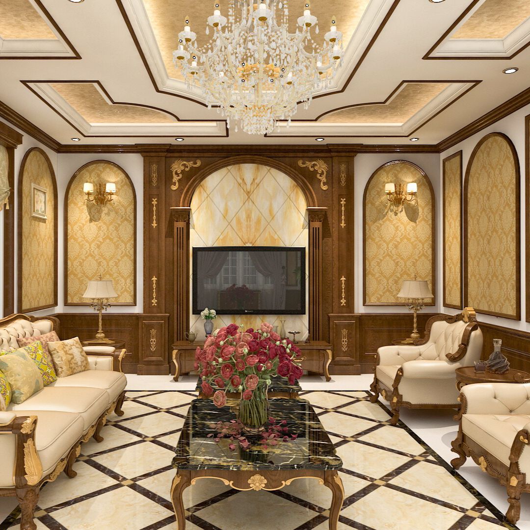 Gỗ tự nhiên đậm màu, sofa uốn cong, tường chỉ nổi hoặc mạ vàng.