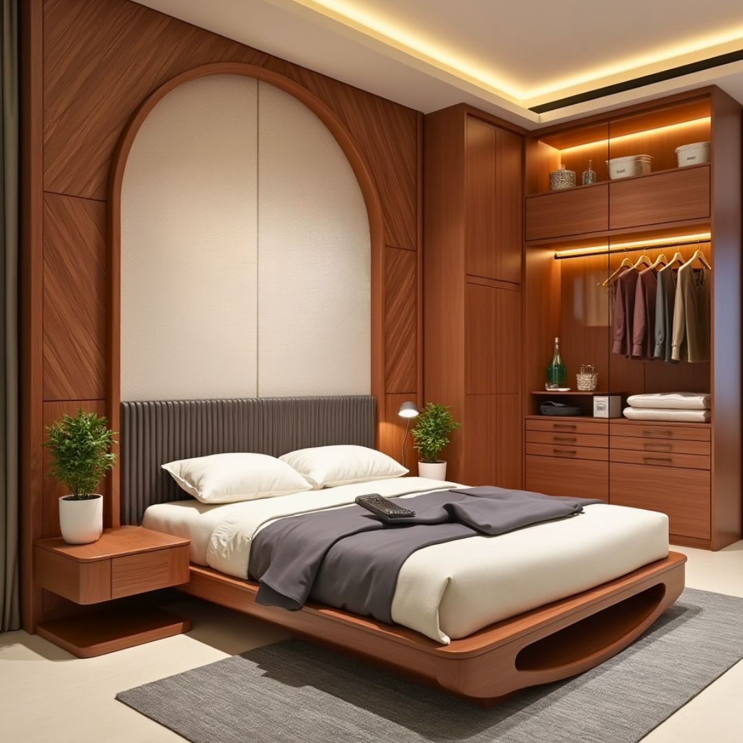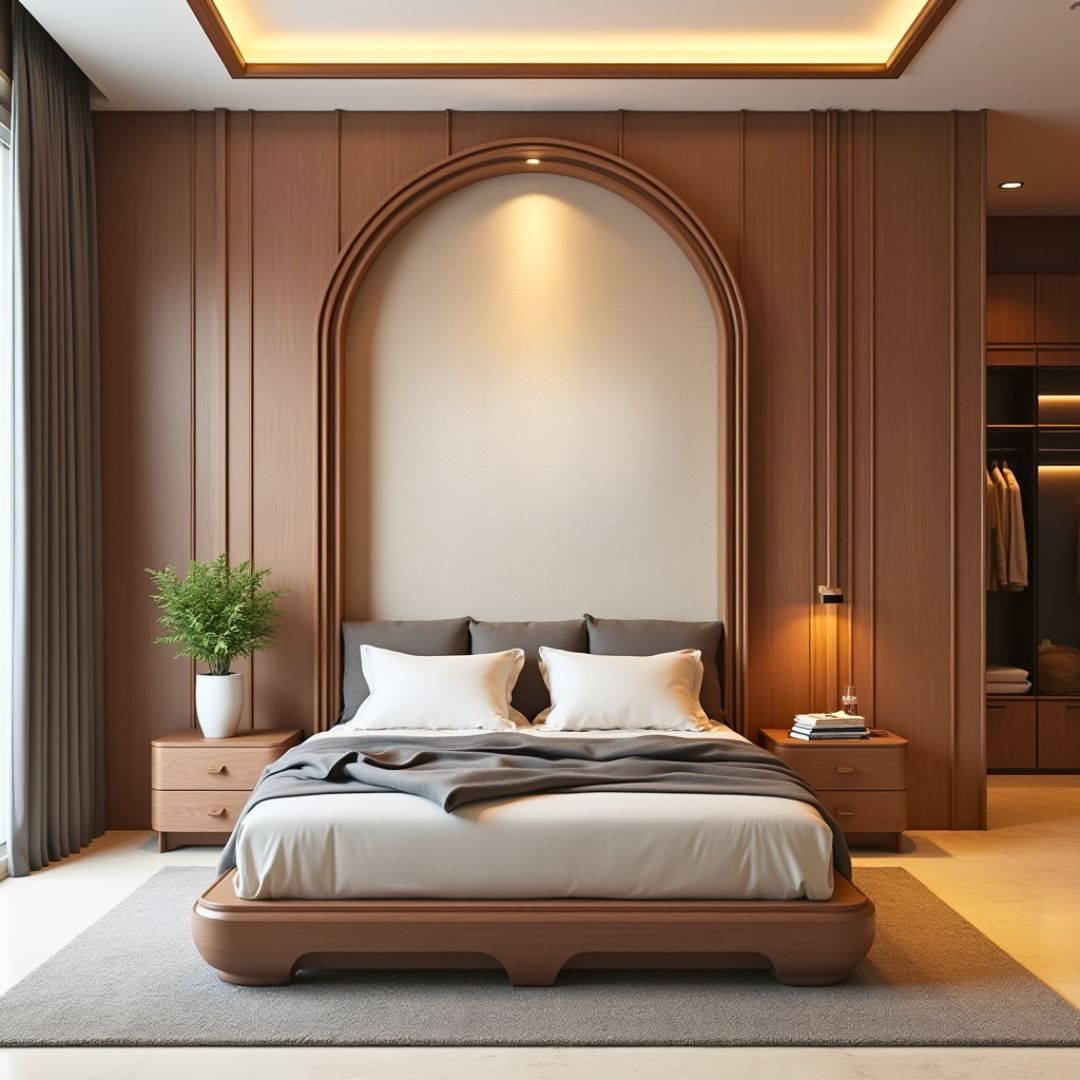 Thiết kế này ghi điểm nhờ bố cục hài hòa giữa chiều cao đầu giường, vòm gỗ và tủ âm tường. Giường gỗ bo cong nhẹ mang lại cảm giác an toàn và ấm cúng. Ánh sáng âm và rèm vải tone lạnh giúp cân bằng với hệ vách gỗ ấm, tạo không gian hiện đại đúng chuẩn khách hàng thành đạt.