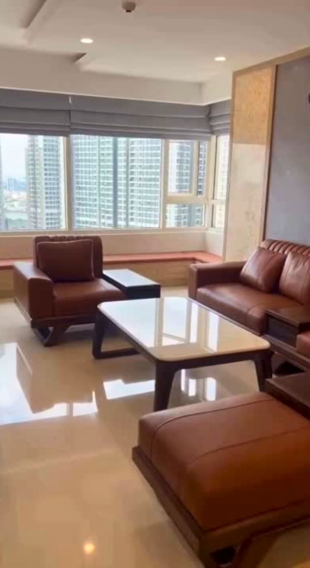 Bên cạnh bộ sofa là tường ốp đá và lam gỗ, sàn bóng nhẹ màu beige, hệ cửa sổ rộng đón ánh sáng tự nhiên. Tất cả đều góp phần nâng đỡ cho nhân vật chính – bộ sofa – tỏa sáng một cách lặng lẽ.