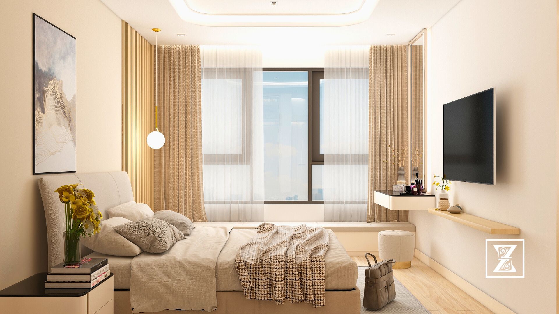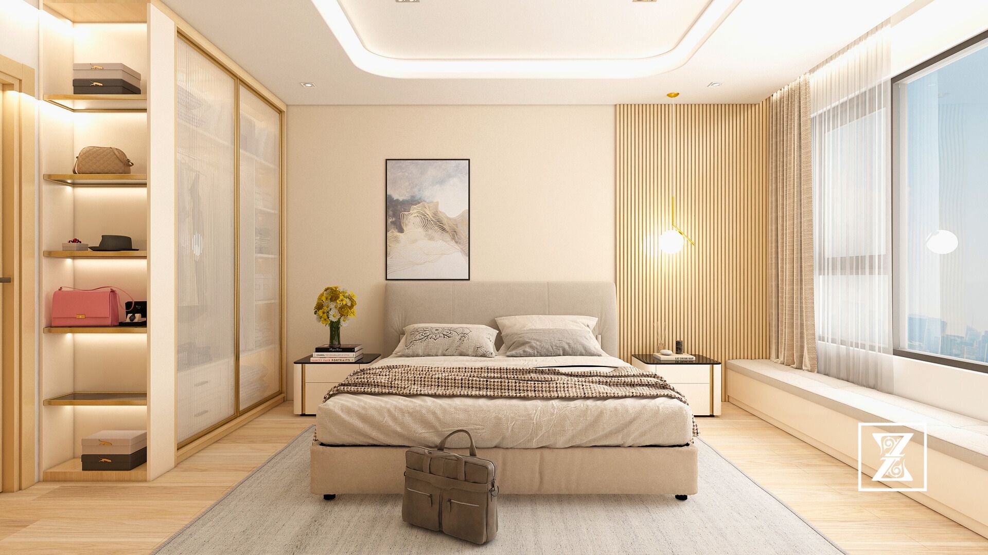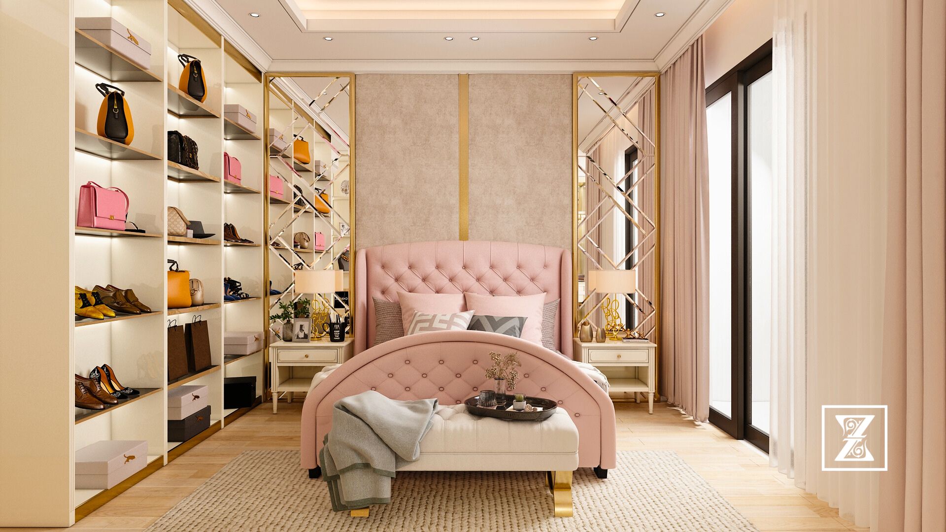 Phòng ngủ này được tạo nên từ sắc độ beige – pastel hồng nhẹ nhàng, mang đến cảm giác thư giãn, thanh lịch mà không mất đi chiều sâu. Chất liệu gỗ cao cấp, thiết kế mềm mại và đồng bộ xuyên suốt từ giường ngủ đến bàn trang điểm, kệ trưng bày túi xách, và cả hệ tủ walk-in closet phía sau.
