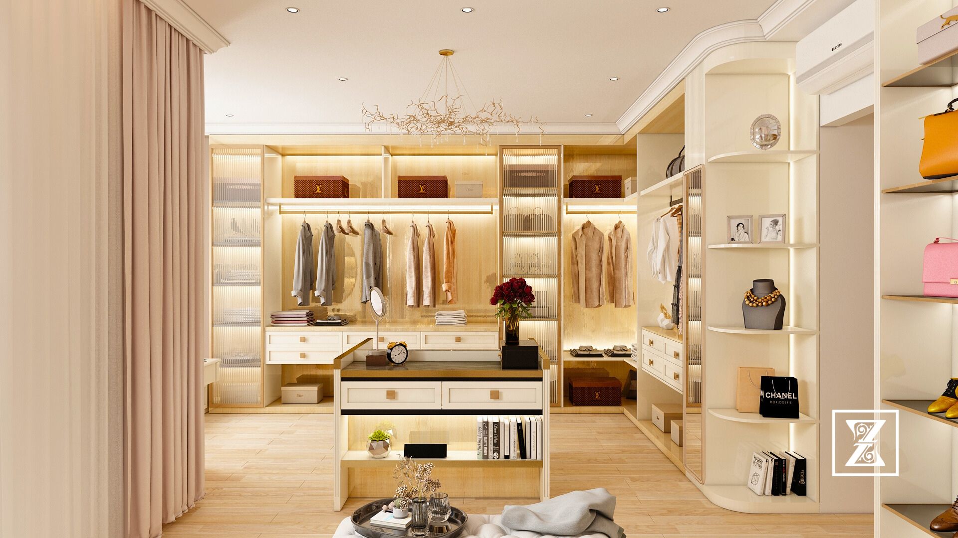 Mọi góc nhỏ đều phục vụ một mục đích: làm nổi bật cá tính, giữ gìn thẩm mỹ, và nuôi dưỡng tinh thần của người phụ nữ sống có chủ đích. Kệ túi được thiết kế như một gallery thu nhỏ. Tủ treo đồ chia ngăn thông minh – phù hợp với thói quen sống ngăn nắp. Bàn phấn đặt cạnh ánh sáng tự nhiên, giúp việc chăm sóc bản thân trở nên nhẹ nhàng như một nghi lễ mỗi sáng.