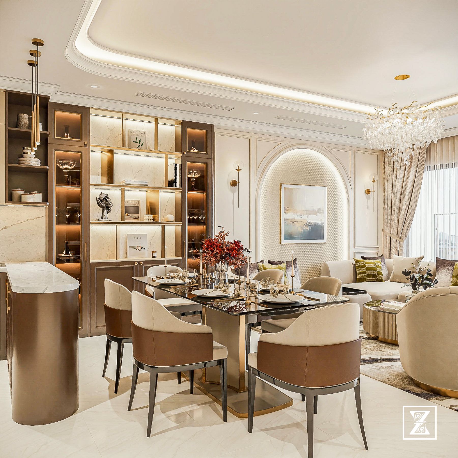 Chi tiết được xử lý khéo léo: từ đèn chùm pha lê với nhánh kim loại ánh gold, đến đường cong mềm mại của sofa và bàn tròn trung tâm. Tường sau TV được ốp đá vân mây tự nhiên, kết hợp kệ trưng bày âm tường, giúp không gian vừa đủ ấm cúng vừa có chiều sâu thị giác. Mỗi đồ vật, mỗi ánh sáng được bố trí có chủ đích – mang đến cảm giác "được chăm chút", "được trân trọng".