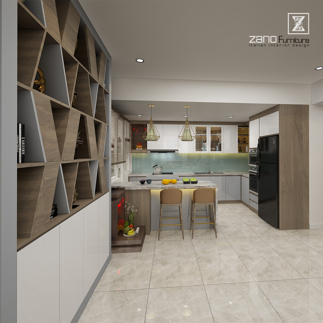 Phòng bếp thiết kế mở với tủ bếp gỗ lõi xanh chống ẩm, bề mặt Acrylic bóng kính kết hợp kính ốp tường màu xanh ngọc. Bàn ăn dài bằng đá kết hợp ghế bọc da nâu, ánh sáng từ đèn thả trần hiện đại tăng thêm sự sang trọng. Khu vực bếp được bố trí khoa học, đảm bảo tiện nghi tối đa.