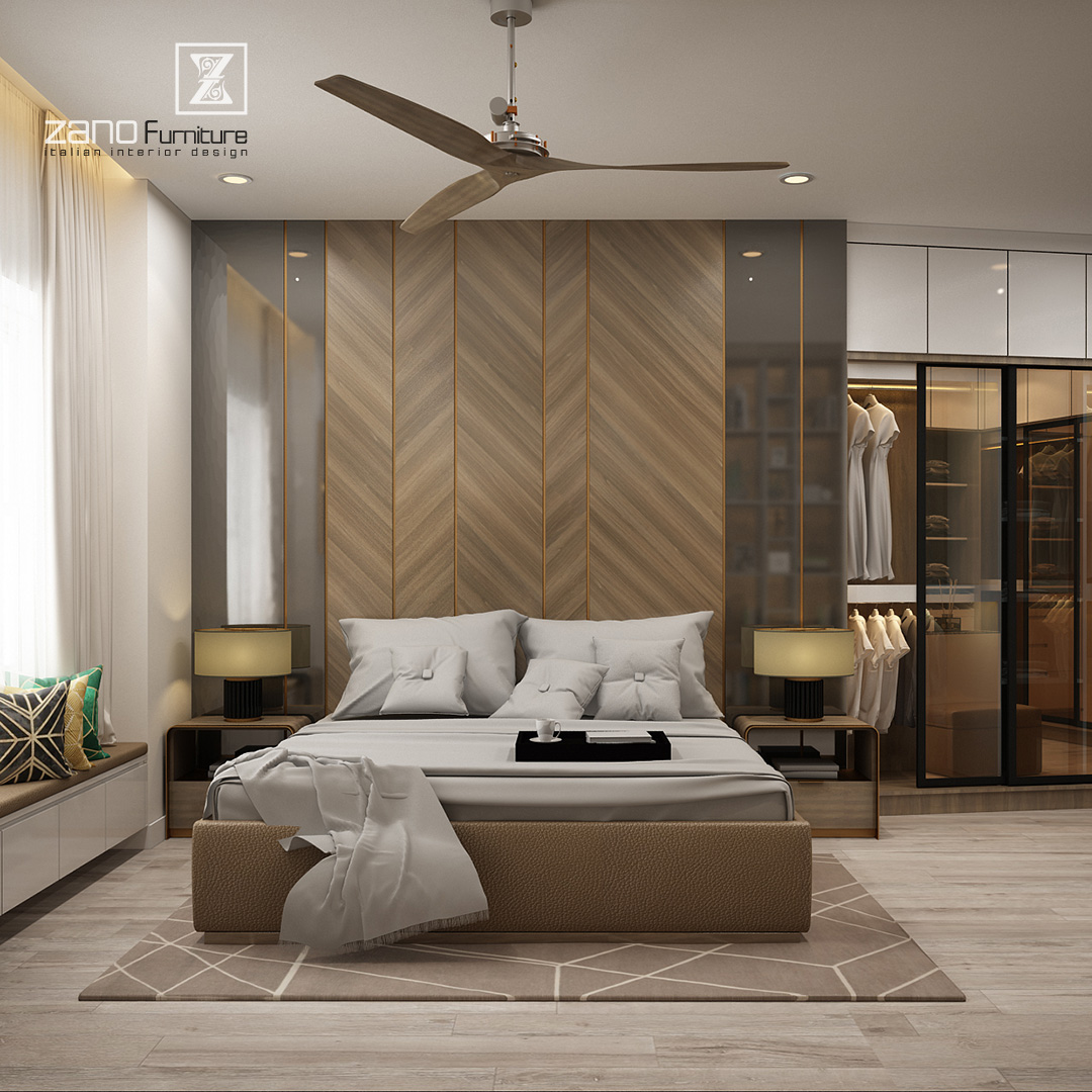 Phòng ngủ master: Sử dụng giường bọc nệm màu kem, vách đầu giường ốp gỗ hiện đại, hệ tủ quần áo cửa kính viền đen sang trọng. Ánh sáng tự nhiên từ cửa sổ lớn kết hợp rèm vải cao cấp, tạo không gian nghỉ ngơi thoải mái.