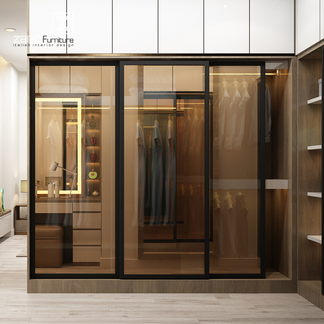 Phòng thay đồ: Thiết kế kệ và tủ kính trong suốt, tối ưu hóa không gian lưu trữ. Gương soi lớn kết hợp ánh sáng LED tinh tế.