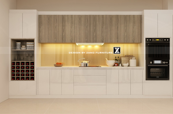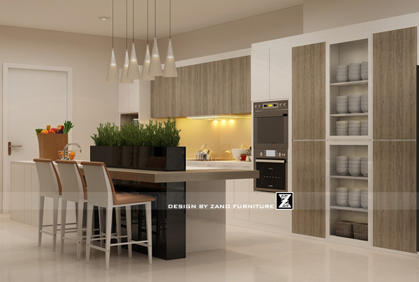Phòng bếp được thiết kế với mặt bếp đá marble trắng, kết hợp tủ bếp gỗ chống ẩm. Quầy bar tích hợp chậu cây xanh tạo sự hài hòa. Hệ tủ âm tường tối ưu không gian, cùng thiết bị bếp cao cấp đảm bảo sự tiện lợi và hiện đại.