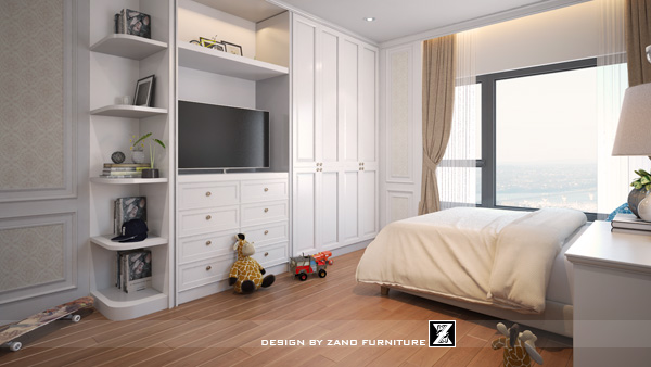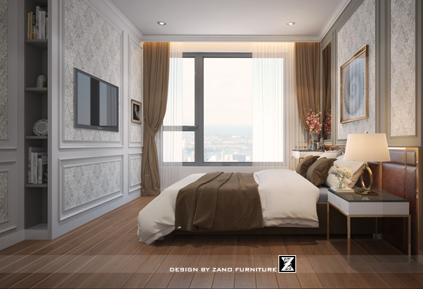 Phòng Ngủ – Riêng Tư & Đầy Tinh Tế: Giường ngủ thiết kế theo phong cách cổ điển, đầu giường bọc da hoặc nệm nhung cao cấp. Tủ quần áo âm tường kết hợp gương lớn, tối ưu không gian. Ban công rộng với rèm cửa mềm mại, mang đến sự thư thái.